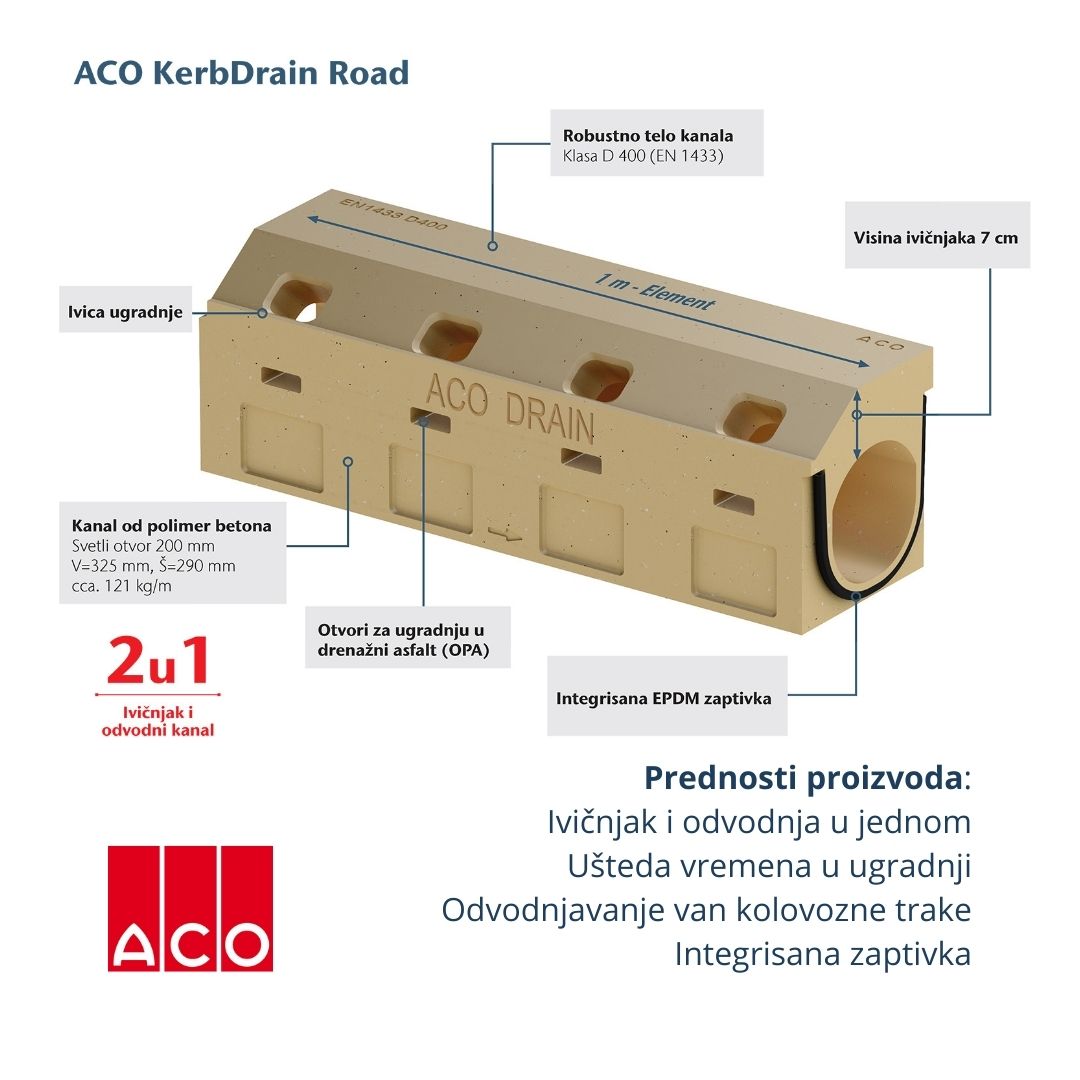ACO KerbDrain Road je jedno rešenje sa 2 funkcije – sjedinjuje ivičnjak i kanal za odvodnjavanje u jedno telo, i tako omogućuje optimalnije planiranje odvodnjavanja sa puteva i magistrala. Zahvaljujući materijalu polimer betonu, ACO KerbDrain Road poseduje odlična svojstva otpornosti na koroziju, smrzavanje i hemikalije, što ga čini primenljivim i na najzahtevnijim mestima.