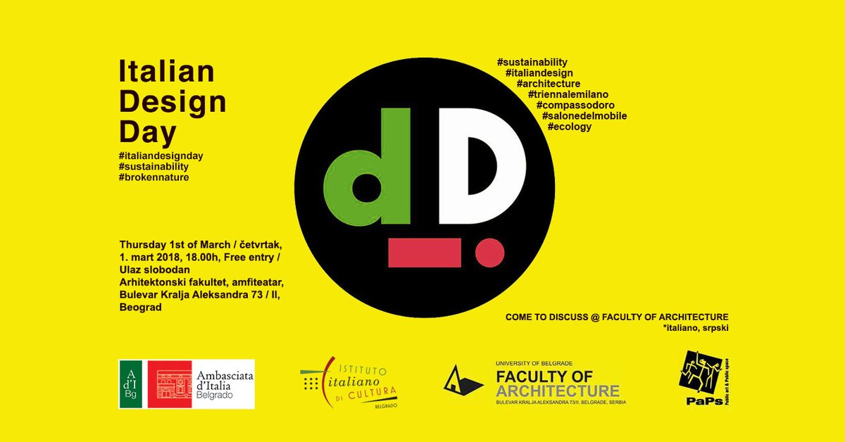 Povodom drugog izdanja Dana italijanskog dizajna Italijanski institut za kulturu u Beogradu organizuje okrugli sto o savremenom dizajnu koji će se održati u četvrtak 1. marta u 18.00 časova na Arhitektonskom fakultetu u Beogradu. Na ovom okruglom stolu učestvovaće arhitekta Frančesko Freza iz studija Piuarch iz Milana, koji će se naći u ulozi “Ambasadora italijanskog dizajna”, arhitekta Vladan Đokić, dekan Arhitektonskog fakulteta u Beogradu, inženjer Danilo Franki iz Energo group-a, arhitekta Tijana Đorđević arhitekta automatizacije zgrada iz 2G Srl u Milanu i arhitekta Zoran Đukanović sa Arhitektonskog fakulteta u Beogradu u ulozi moderatora. Oslanjajući se na sopstvena iskustva i različite individualne poglede oni će diskutovati o odnosu između dizajna i održivosti u ekonomskom, društvenom i ambijentalnom smislu. Cilj je da se istraži šta svet projektovanja može da pruži kao poseban doprinos uvažavanju prirode i ljudskog bića.