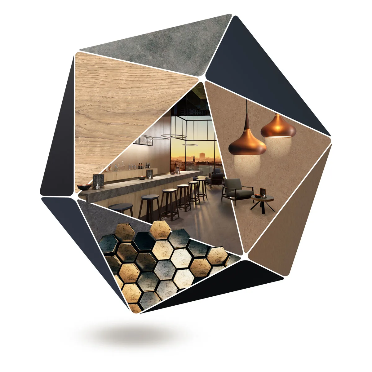 Kod uređenja javnih prostora sve više se traže smireni i topli materijali. Topli drvni dekori sa svetlim, prirodnim elementima daju prirodnost koja ne deluje previše rustikalno. Uzbudljivi metalik efekti odišu izrazitom elegancijom, naročito u javnim prostorima poput ugostiteljskih objekata. Efekti kamena, s toplom igrom boja u kombinaciji s tamnim uni dekorima, kreiraju vrlo upečatljiv izgled.
