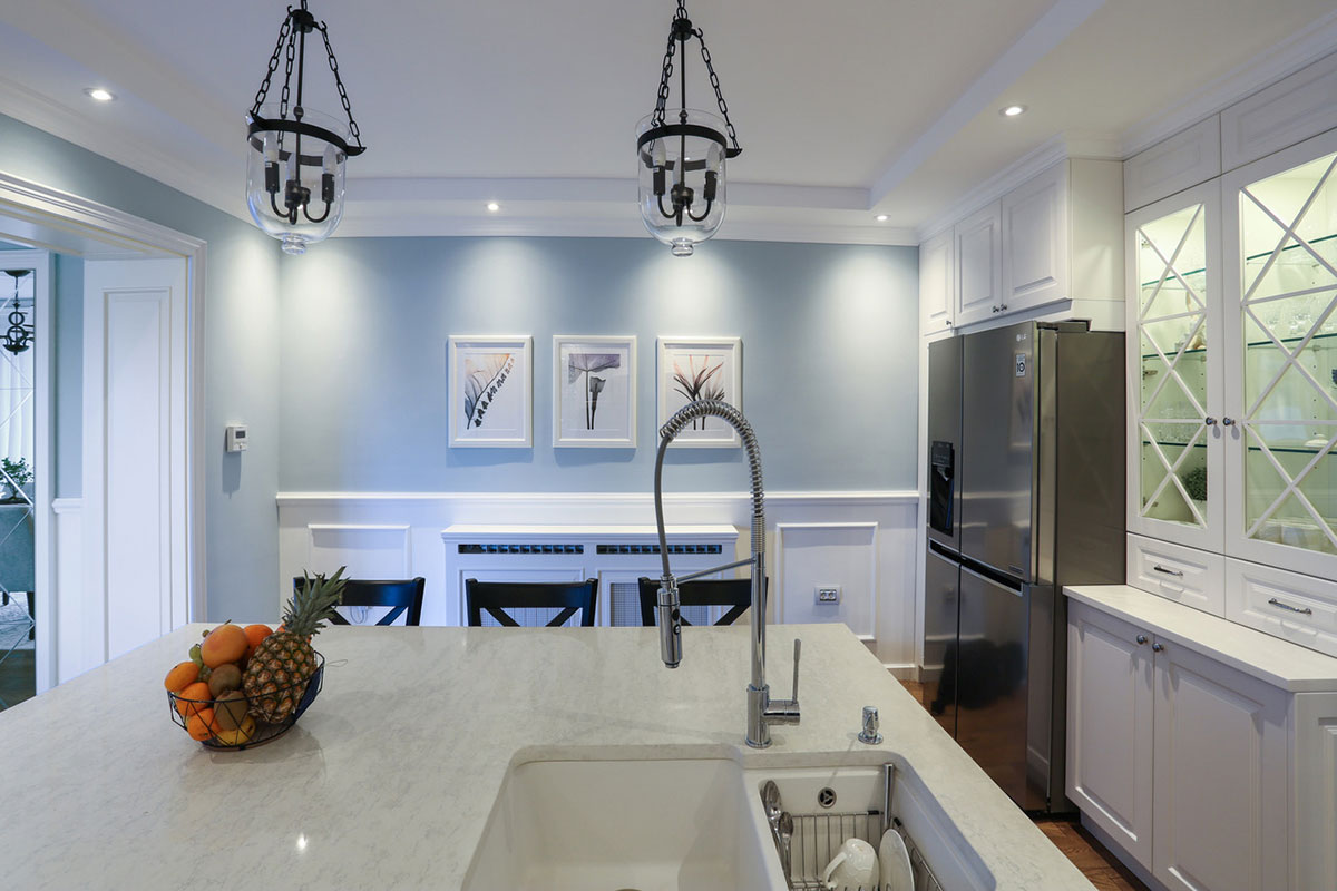 Osim standardnih bež ili braon boja popularnih u opremanju enterijera, hrabrom odlukom arhitekte i spremnošću investitora da izađe iz šablona, u ovoj „američkoj kući“ uvedena je i plavo/bela kao opcija. Plava boja zidova i beli kuhinjski elementi dali su odlične rezultate i učinile ovaj prostor upravo toplim iako ove dve boje po svojoj prirodi spadaju u paletu hladnih tonova. Ipak plavo – bela kuhinja je jednostavno neodoljiva, daleko od toga da je „hladna“ zbog odabira boja. Za potpuni utisak topline doprineli su hrastov parket, kao i trpezarijski sto i stolice.