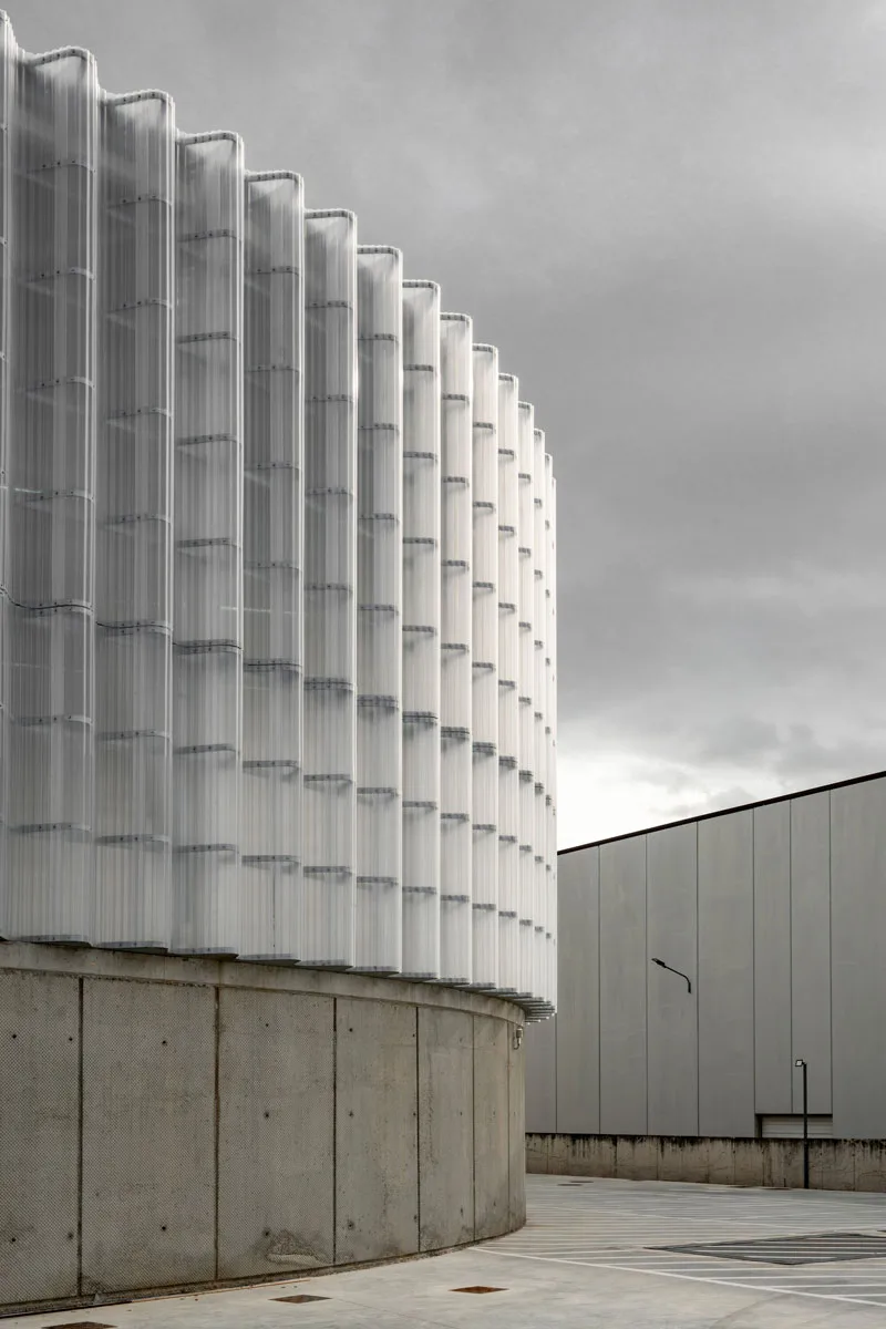 Arhitektura Centralnog postrojenja je simbolična kako u svojoj geometriji baziranoj na energetskoj i ekonomskoj cirkularnosti, tako i u svojoj materijalnosti koja se opredeljuje za doslovnu i pedagošku transparentnost predstavljajući celinu kao identitet. Dva glavna elementa čine zgradu: kalup od teškog betona i lagana fasada od čelika i plastike koji se mogu reciklirati. Betonska osnova služi kao podrška za sve mašine i uspostavlja zemaljske veze s spoljnim svetom kroz dvoje velikih, pocinkovanih čeličnih vrata zajedno sa silosom za biomasu koji se nalazi ispod zemlje. Unutrašnjost betonske baze ima poklopac koji se pretvara u obodni prolaz koji okružuje sve mašine. Pod oblika pilule omogućava optimalan prolaz posetilaca oko kompletnog energetskog procesa. Čelični i plastični omot oko objekta reinterpretira ekonomska rešenja tipična za industrijske zgrade kako bi uspostavio značajnu vezu sa zajednicom koju služi: mali katedralni prostor energije. Fasada od polikarbonatnih ploča, rebrasta na tri skale, konfigurisana je kao mekani beličasti veo podržan na delikatnoj pocinkovanoj i obojenoj čeličnoj konstrukciji. Kao završnica, providni toranj izbacuje beli dim koji nastaje tokom procesa filtriranja i koji zauzima veći deo industrijskog prostora.