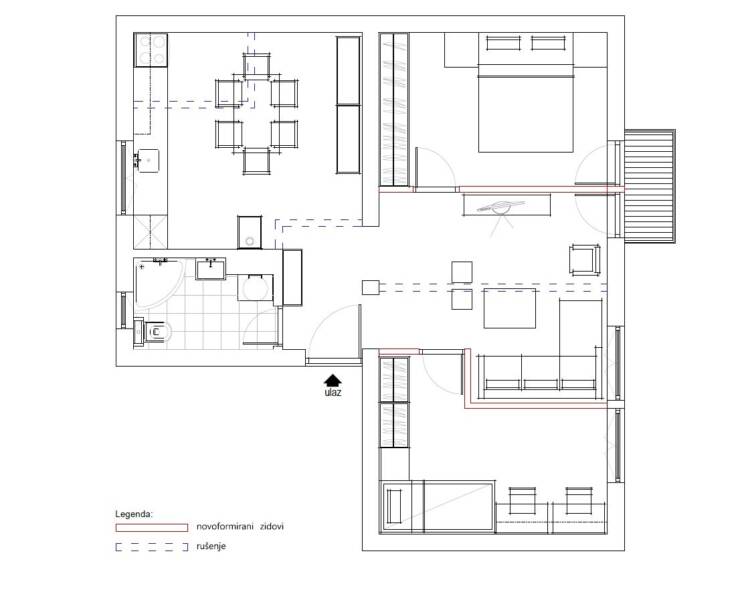 Pregradom velike sobe dobili smo zasebne sobe – za baku i za dete. Delimičnim rušenjem pregradnog zida između dnevnog boravka i kuhinje dobili smo prostraniji “dnevni” deo stana sa mnogo više svetla koje daje veliki prozor u kuhinji. Projekat je podrazumevao I rušenje ostave čime smo dobili veću, prostraniju kuhinju. Ono što je najbitnije postigli smo kružnu vezu u stanu i time ostvarili vizuelno prostranije i funkcionalnije prostorije, a svakako i olakšano kretanje za najstarijeg člana porodice i brže komunikacije unutar stana.