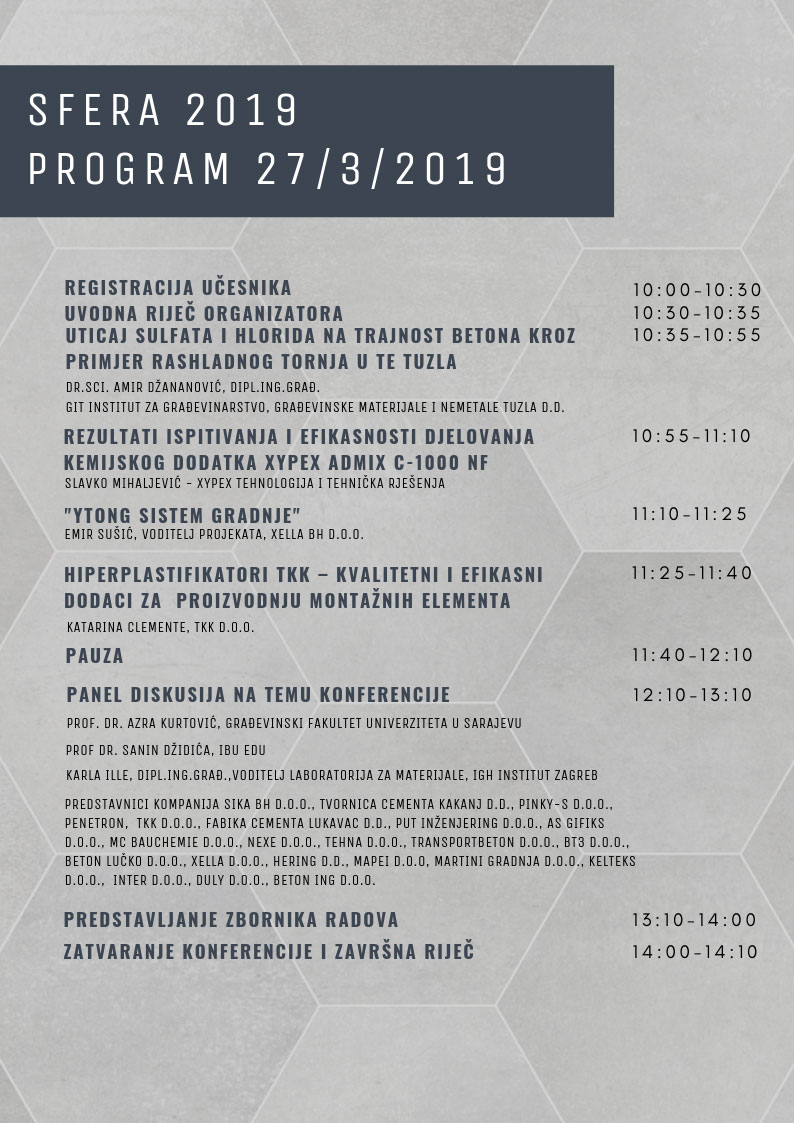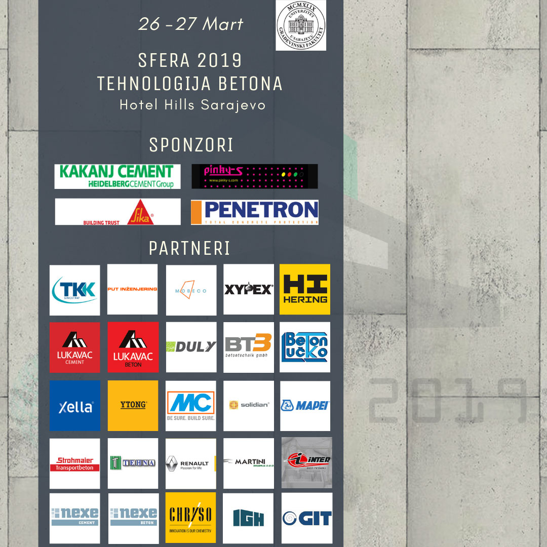 Kompanija Sfera d.o.o. Mostar u saradnji sa GraÄevinskim fakultetom Sarajevo, IGH institutom iz Zagreba, te GIT institutom iz Tuzle, organizuje VII po redu MeÄunarodnu nauÄno struÄnu konferenciju “Sfera 2019:Tehnologija betona“ koja Äe se održati 26. i 27.03.2019. godine u Hotelu Hills u Sarajevu.